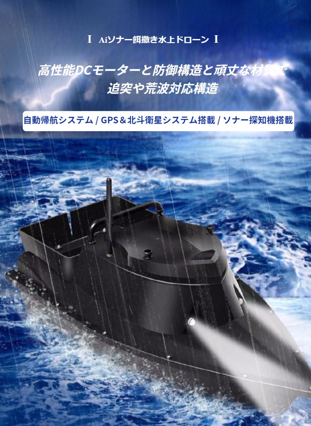 機能:GPS/北斗衛星、Ai自動帰航、魚群探知レーダー、大容量積載荷重、500m遠距離操縦、高速ダブルエンジン